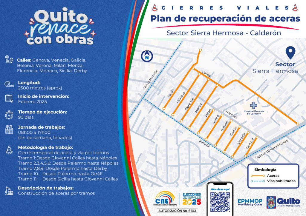 Este mes, la Empresa Pública Metropolitana de Movilidad y Obras Públicas (Epmmop) avanza con un nuevo frente de obras para rehabilitación de aceras en el barrio Sierra Hermosa de Calderón, con especial énfasis en brindar seguridad a la movilidad peatonal del sector del Hospital Docente.