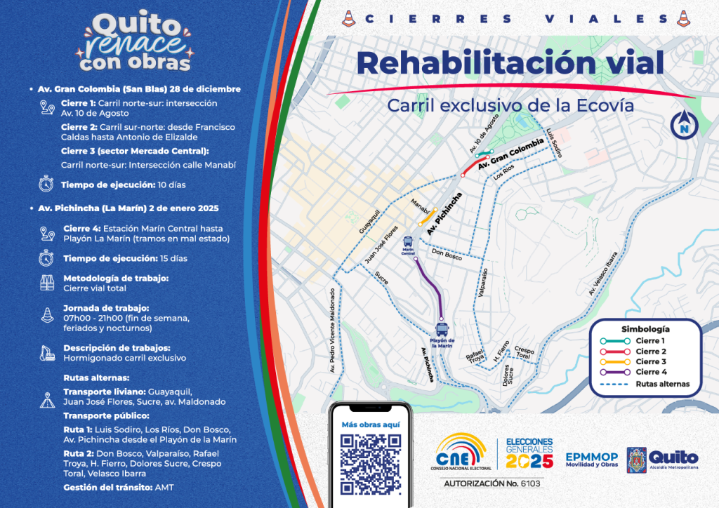 Desde el 28 de diciembre los trabajos de hormigonado del carril exclusivo se concentrarán en cuatro áreas claves de la movilidad del Centro Histórico, que influirán en la circulación vehicular y generarán el cierre de las avenidas Gran Colombia en el tramo de La Alameda, y el cierre parcial de la avenida Pichincha en los sectores de San Blas y La Marín.